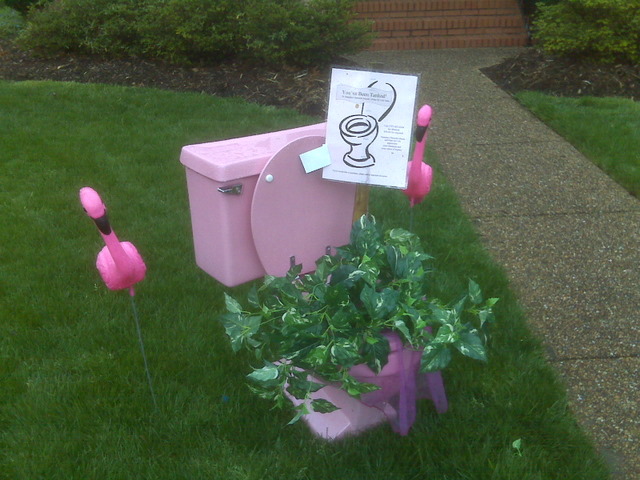 Local car dealership, Hampton Chevrolet, gets in on supporting the local “Relay for Life”. $50 donation for the removal of the pink toilet and matching flamingos.