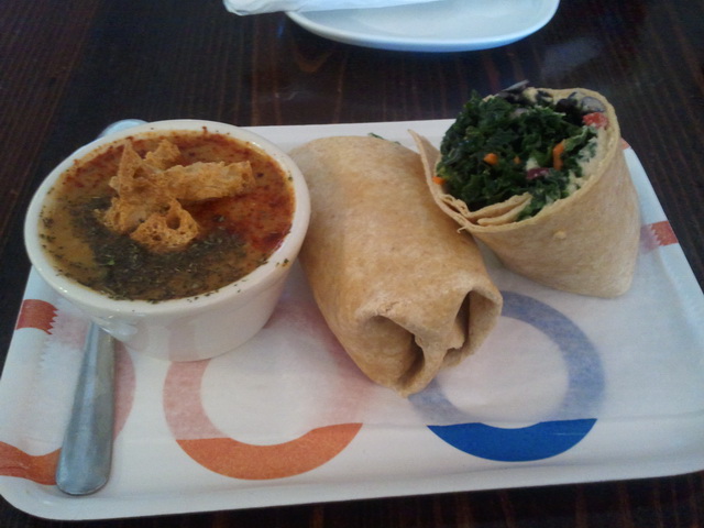 Red lentil soup topped with dill and cayenne pepper, and a wrap with hummus, kale, and black bean and corn salad. To die for, from Pasha Mezze in Norfolk, VA.