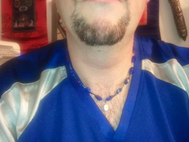 This necklace, made of glass beads and carrying a charm that says “Believe”. The necklace, made by my housemate, Tink, is unique in that between each large glass bead, there is a long thin blue cylinder bead and a short grey one, and then a large glass bead, and a long thin grey cylinder bead and a short blue one, repeated around the necklace.
