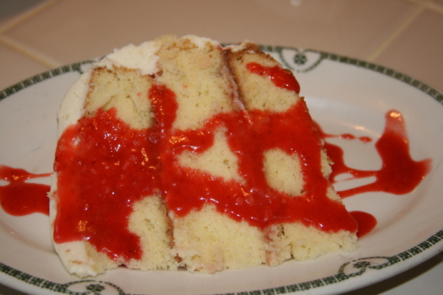 It’s a three-layered white chocolate génoise, with a strawberry glaze atop. I made it for dad for his birthday in 2008. He liked it so much that I wasn’t allowed to take it back home with me!