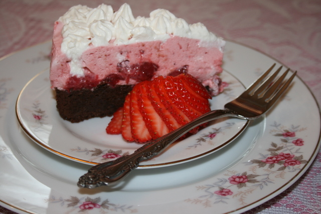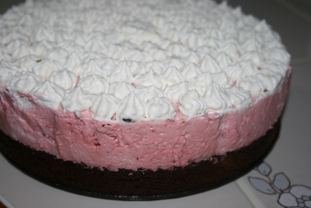 You can see the layers of strawberry mousse and the chocolate brownie bottom. Finally: