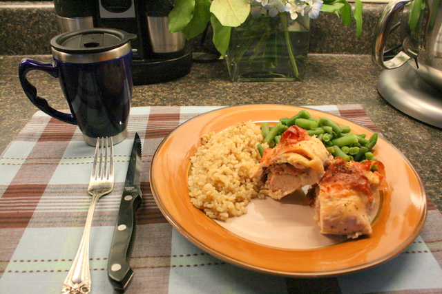 I tarted it up a bit with extra prosciutto on top (you have to be careful, it’s very salty), and served it up with brown rice (cooked in chicken broth) and green beans.