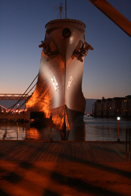 The USS Wisconsin, before the Navy deeded her back to the City of Norfolk, berthed beside Nauticus. I love the angles, the lighting, the colours…the way the camera captured the mood as the sun slipped below the horizon.