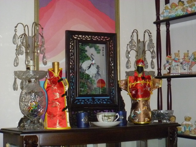 I have a coworker that gives me a delightful bottle of wine every year for the holidays. Since she learned that I am unable to drink most reds (they cause massive migraines), she’s resorted to the whites and the blushes. She also makes sure they come in very cute wine covers. The female kimono on the left was one year, the male on the right (with hat and pony tail) was the next. (Have no fear, the wine is swapped out regularly!) The silk artwork between was a gift from a group of Chinese students, and the teacup in the middle? Well, of course, that’s for when I have to have a spot of tea (which is, invariably, almost every evening).