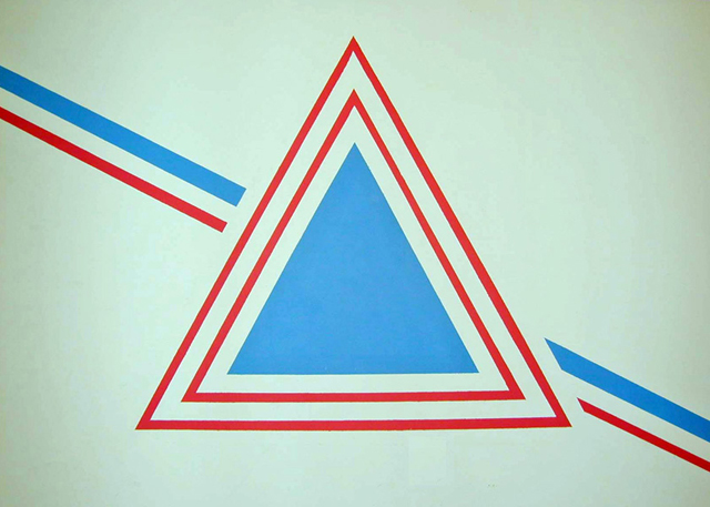 The wall was painted Federal Slate (a light blue), and it would still be another year before I took the moniker “Silver Blue”. The width between each triangle, and the diagonal stripe is 2″ — the width of the largest masking tape I had in the house. The top blue line is 2″ wide, the bottom red line is 1″ wide, and the red triangles are 1″ wide as well.