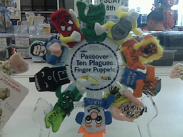 Trust the local “Bed, Bath & Beyond” to carry finger puppets to provide for your plague playing pleasure. I’m glad there weren’t more than 10 plagues or they’d have to include velcro fingers to hold the additional plagues on mankind.