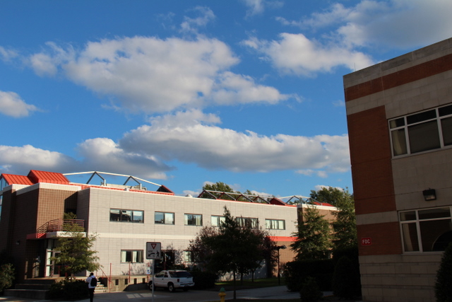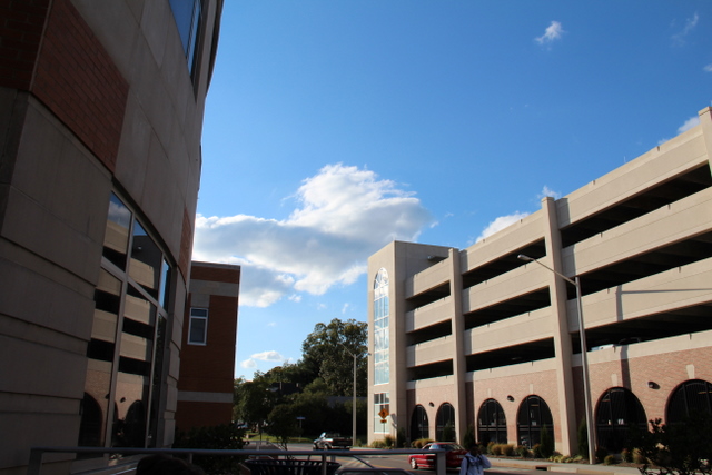 Just a parking garage (on the right) and the building I work in (on the left) but I like the reflections and such.