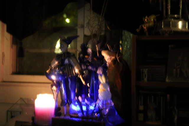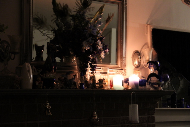 I was playing around with the new camera from work and the higher ISO speeds to put the camera through its paces. This is my mantle, with a turquoise candle for healing, a blue (that looks purple) candle for clarity, and since it’s nearing Halloween, a beautiful feathered mask in blue and silver.