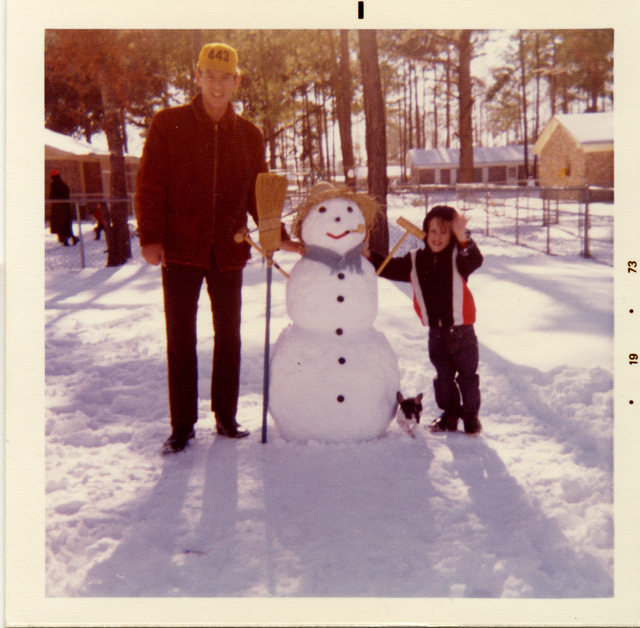 Dad, The snowman, “Tiny”, our chihuahua, and me.