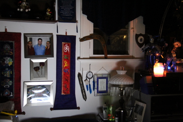 I have my tapestries from the monks, the photos of me with them, two roses (from the opening and closing altars), the mandala, an incense holder, a dreamcatcher, stained glass, a tapestry from the Dalai Lama, and a boomerang from the Aborigines in Australia. Then, there’s the family crest, the Storm Watch candle, the soapstone incense burner, and also Mama Quinn, and the Harlequin from N’Awlins.