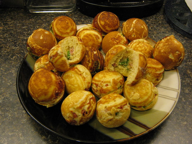 These are Ebelskiver (some spell it Æbelskiver). Danish puff pancake balls. They can be savory (as above, with ham, swiss cheese, and scallions), or sweet: