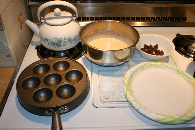 Here, you can see the pan, the batter, the Hershey Kisses that would go inside. You fill the wells with about 2 tbsp batter, and after about a minute, drop the filling in, then cover another another 2 tbsp batter. After another minute or two, using two chopsticks, or two skewers, you “roll” the Ebelskiver in their individual wells. They pull into the full round shape. Cook for another minute or two and serve hot. Savory, they’re great with salads. Sweet, they’re the perfect ending of a meal.