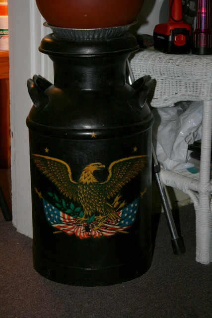 Years and years (and years) ago, when I was growing up, my Grandmother bought an old milk can. It was restored by mom and her sisters. Sanded down, repainted black, and an applique decal from Root’s Lumber applied: