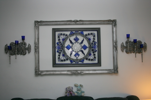 The piece of stained glass above my sofa (and my two plush companions, Blackberry Bear, and Roxette Bunny™ to my mantlepiece: