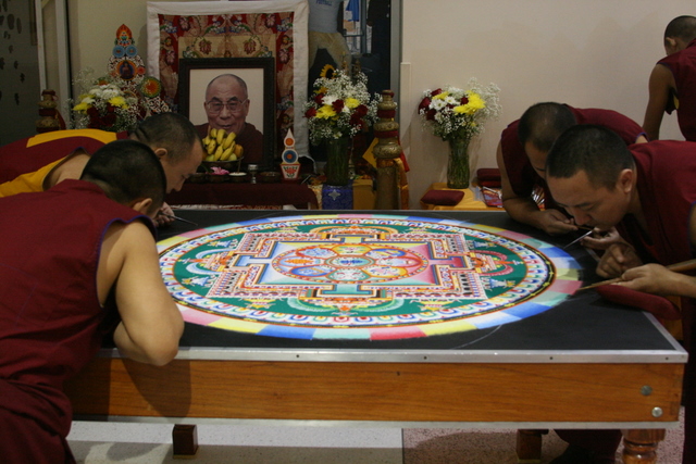 A better view of the altar. The mandala represents the energies of the universe, and is “destroyed” upon completion, to show the energies merging again…