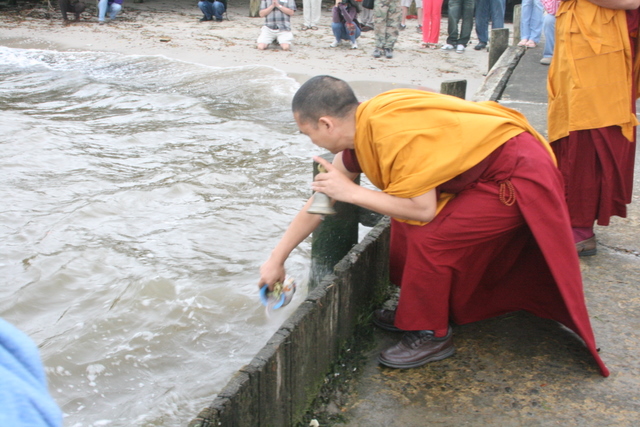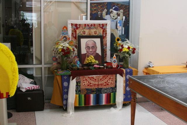 …which took the better part of the week to construct. They had, in the background, an altar of sorts with a picture of HH Dalai Lama, fresh fruit, and fresh flowers: