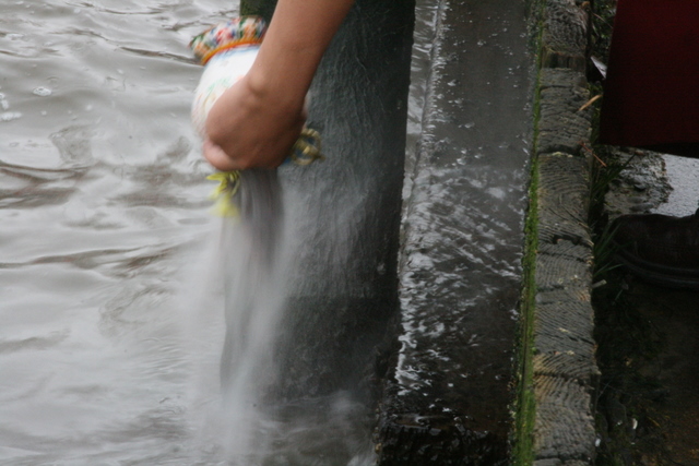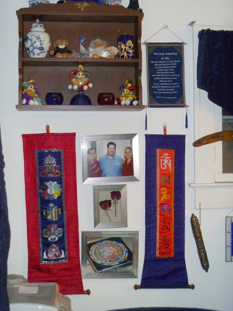 The roses are from the opening altar and the closing altar (they’ve been pressed and dried). The upper photo is also above, the lower photo is of the completed mandala. The blue tapestry to the right is the “Om Mani Padme Hum“. The metal canister to the right is an incense holder. The tapestry to the left spoke to me, but I do not know what it means.