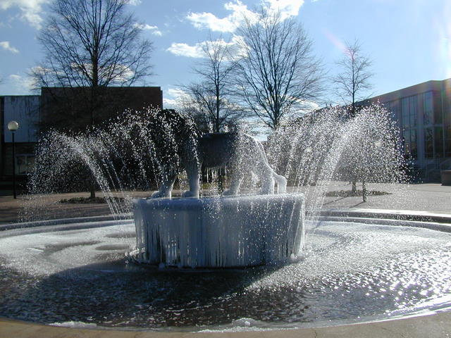 On campus, they forgot to shut the lion fountain off. This is one of my favourite wintertime photos, taken in January 2000.